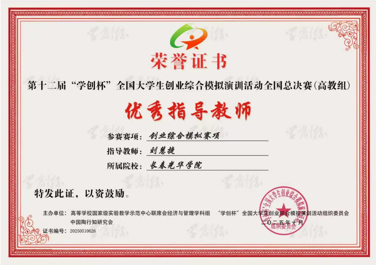 近日,第十二届“学创杯”全国大学生创业综合模拟演训活动总决赛(高教组)在成都理工大学圆满收官。我校参赛学生团队凭借扎实的专业素养与出色的实践能力,斩获全国总决赛二等奖1项;创新创业学院刘晓红、刘慧捷两位教师因指导成效显著,获评“优秀指导教师”称号。